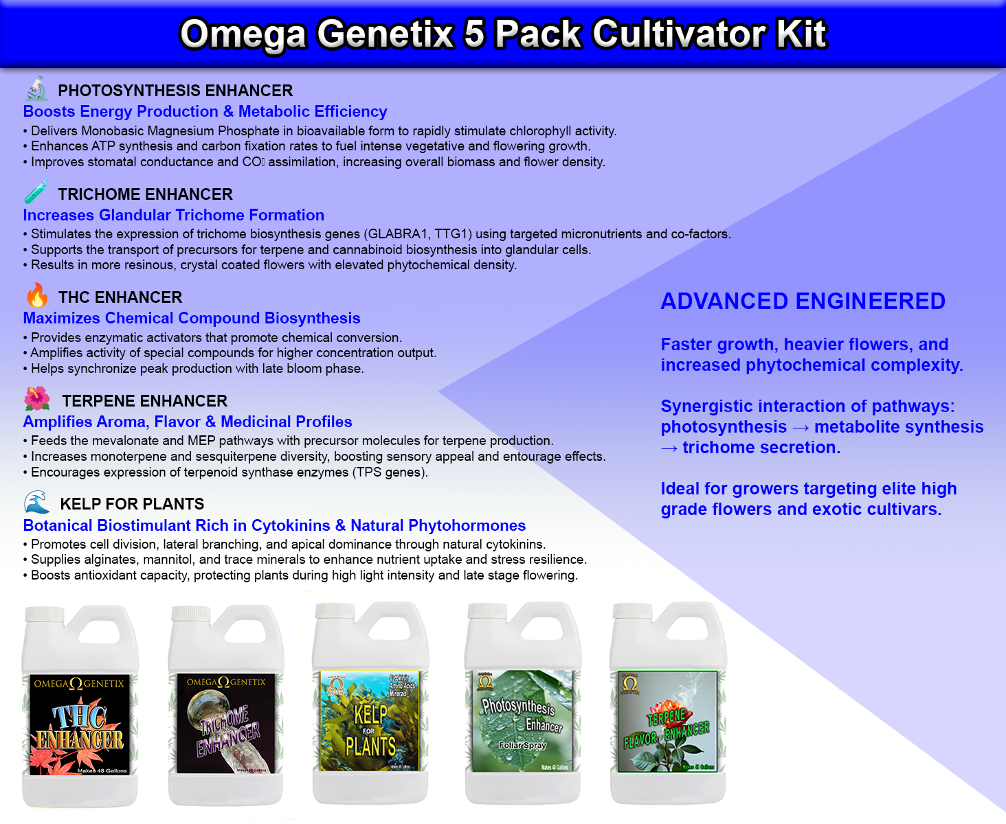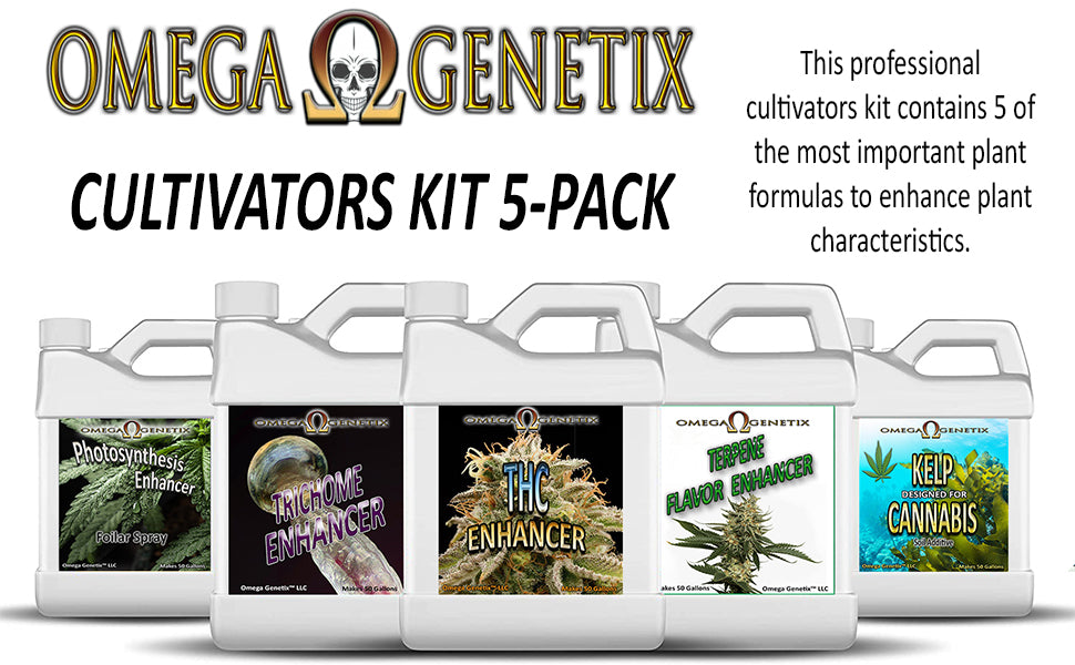 Omega Genetix LLC Laboratory has developed a kit for cultivators that want to boost their plants potential beyond its normal threshold to produce monster buds with high levels of THC, terpenes, terpenoids, cannabinoids, trichomes and shortens maturation time.