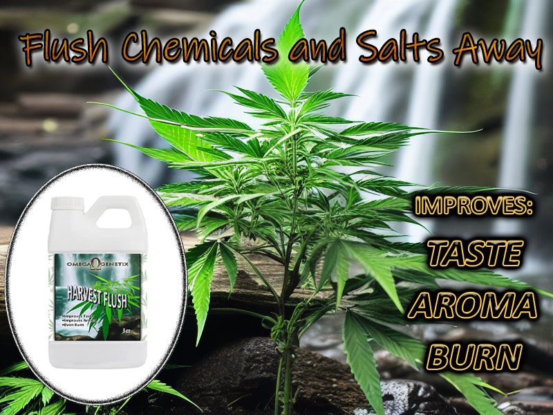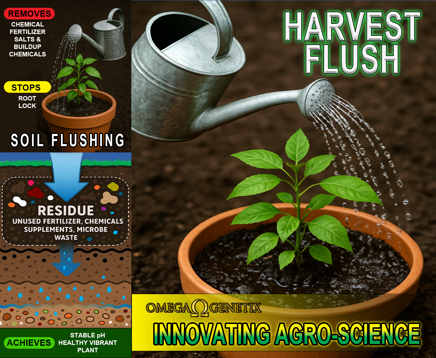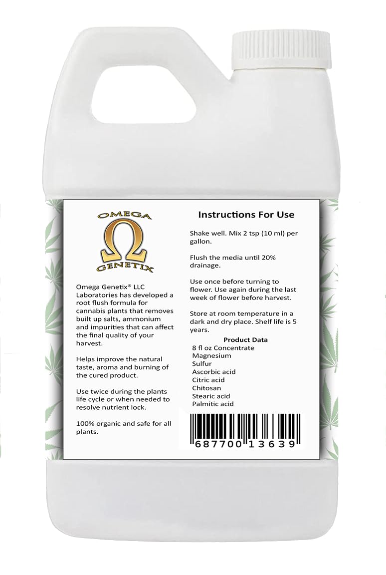 Omega Genetix Laboratory has developed HARVEST FLUSH, a root flush formula for cannabis plants that removes any built-up salts and impurities that can affect the final quality of your harvest. This improves the taste, aroma and burning of the cured product.