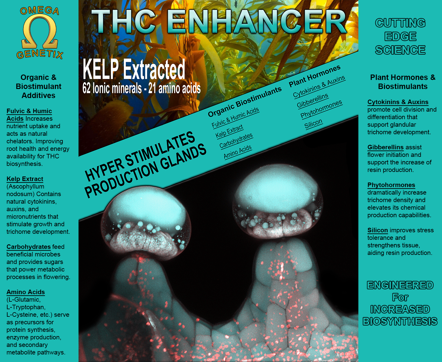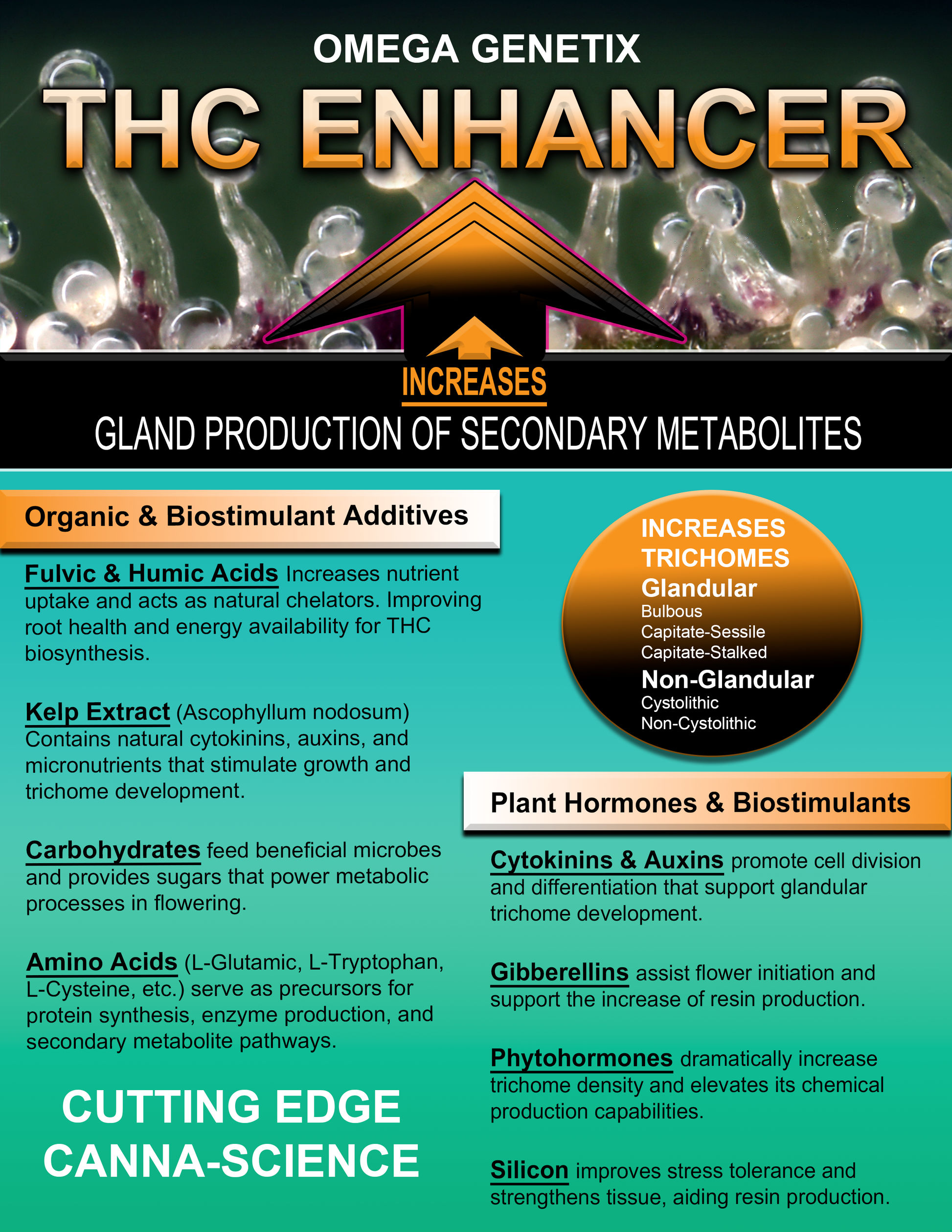 THC Enhancer, developed by Omega Genetix LLC Laboratory, is a carefully formulated concentrate that utilizes 62 vital divalent ionic minerals extracted from Northern Pacific Ocean water to enhance the metabolic transformation process in cannabis plant trichomes.